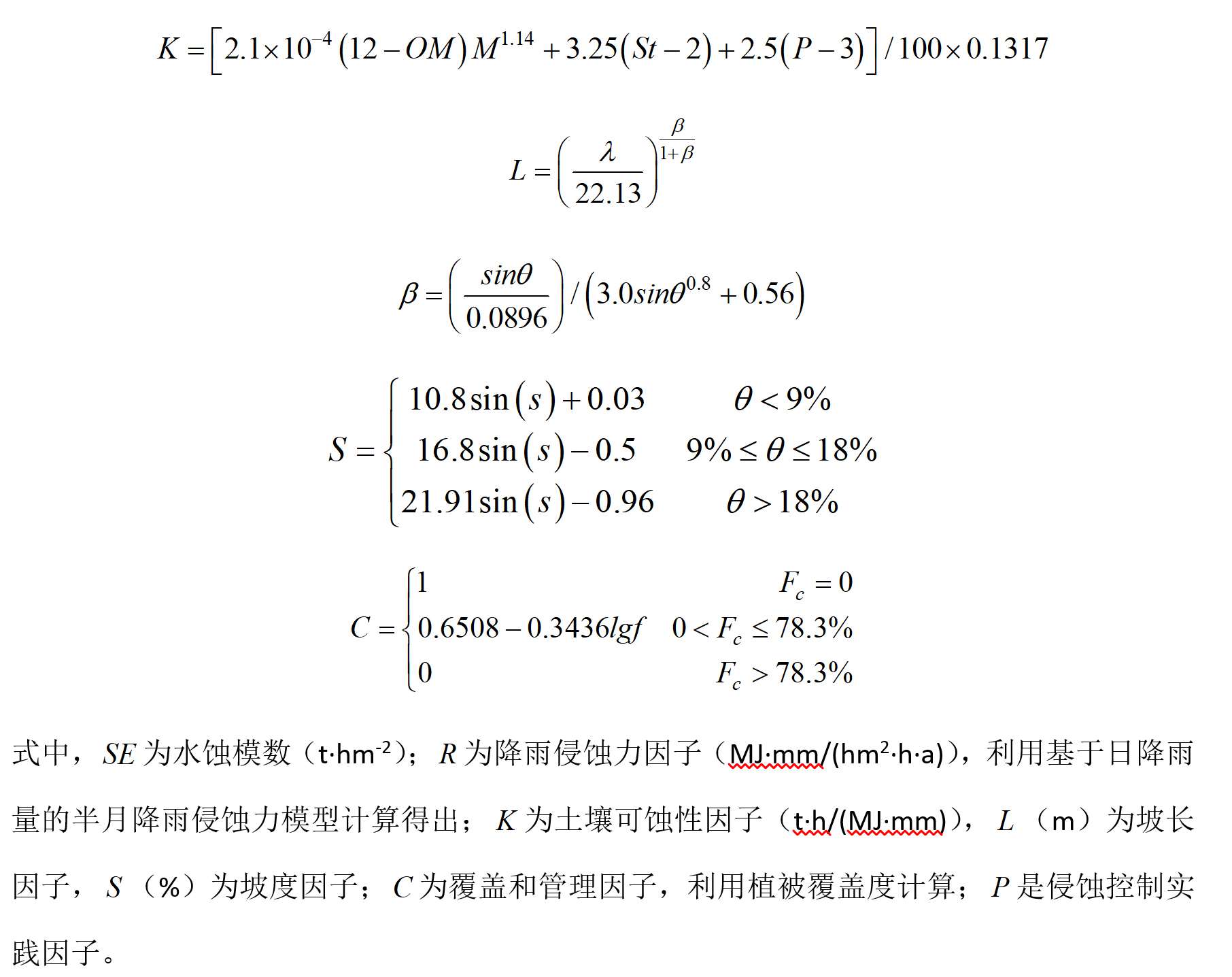 水蚀模数基于修正的通用水土流失方程(RUSLE,Revised Universal Soil Loss Equation)计算单位面积的水土流失量,即土壤侵蚀模数。通用水土流失方程中包含6大因子,降雨侵蚀力因子(R)、土壤可蚀性因子(K)、坡长因子(L)、坡度因子(S)、覆盖和管理因子(C)以及水土保持措施因子(P),详见公式: