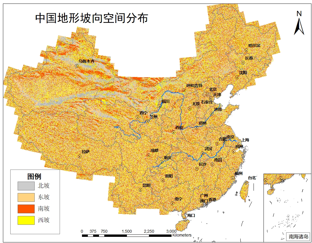 中国地形坡向空间分布数据是基于中国500m海拔高程DEM数据通过坡向计算获取的。