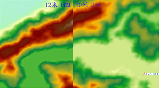 相对于SRTM 30m 90m 的DEM数据,ALOS 12.5m的DEM还是比较精细的从下图可以直观的对比下3种数据的差别。